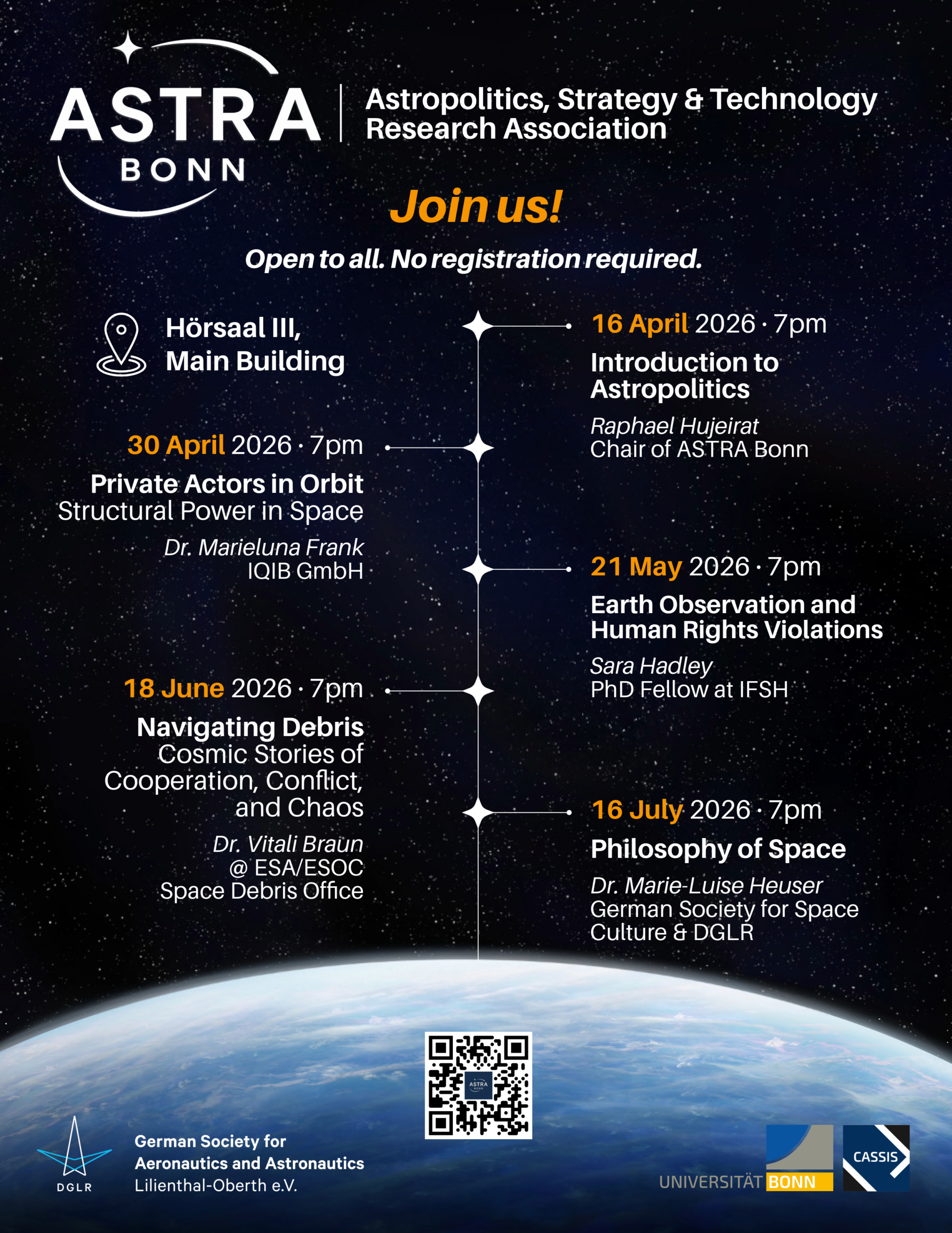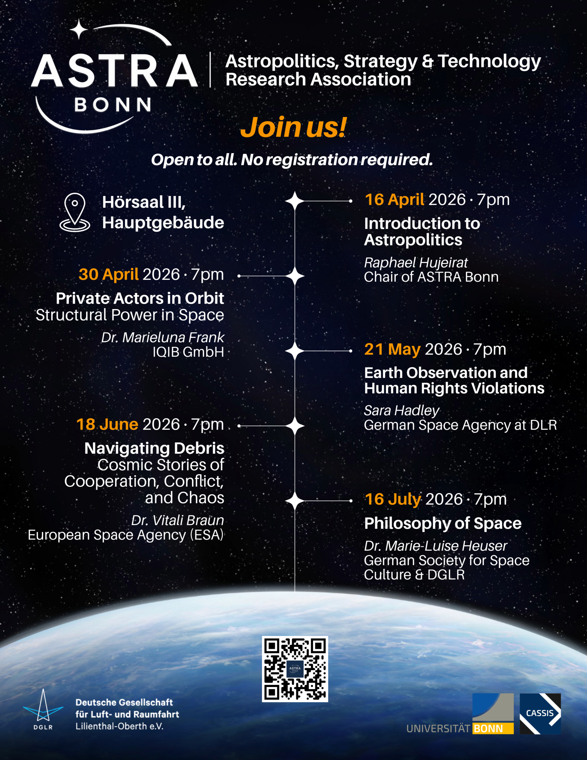 ASTRA Bonn brings together students across strategy, politics, law, economics, philosophy and STEM to analyse space developments and their broader strategic, political, technological and societal implications.